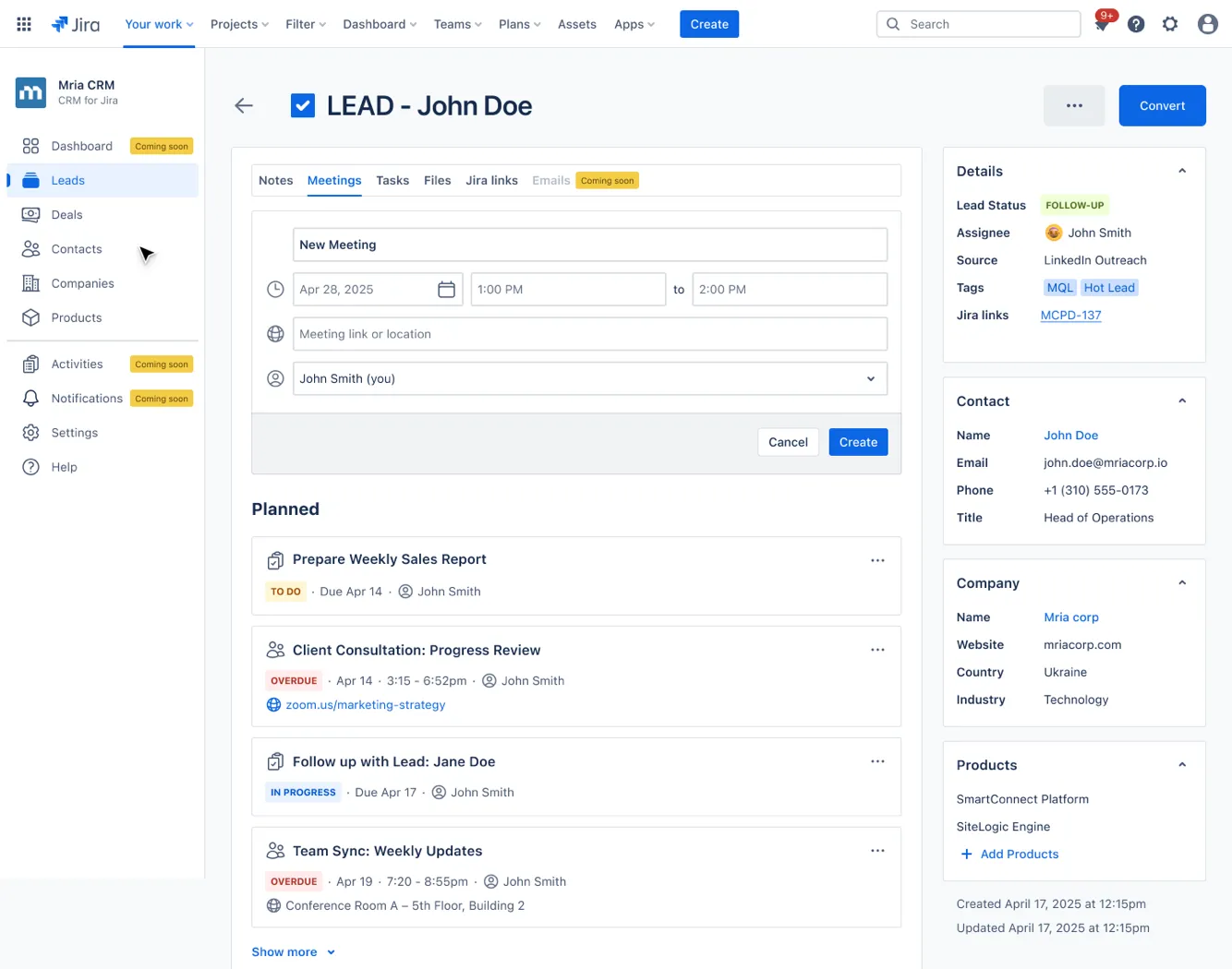 Mria CRM gives you a complete CRM model inside Jira with Leads, Deals, Contacts, Companies, Products, and Activities working together as one system.