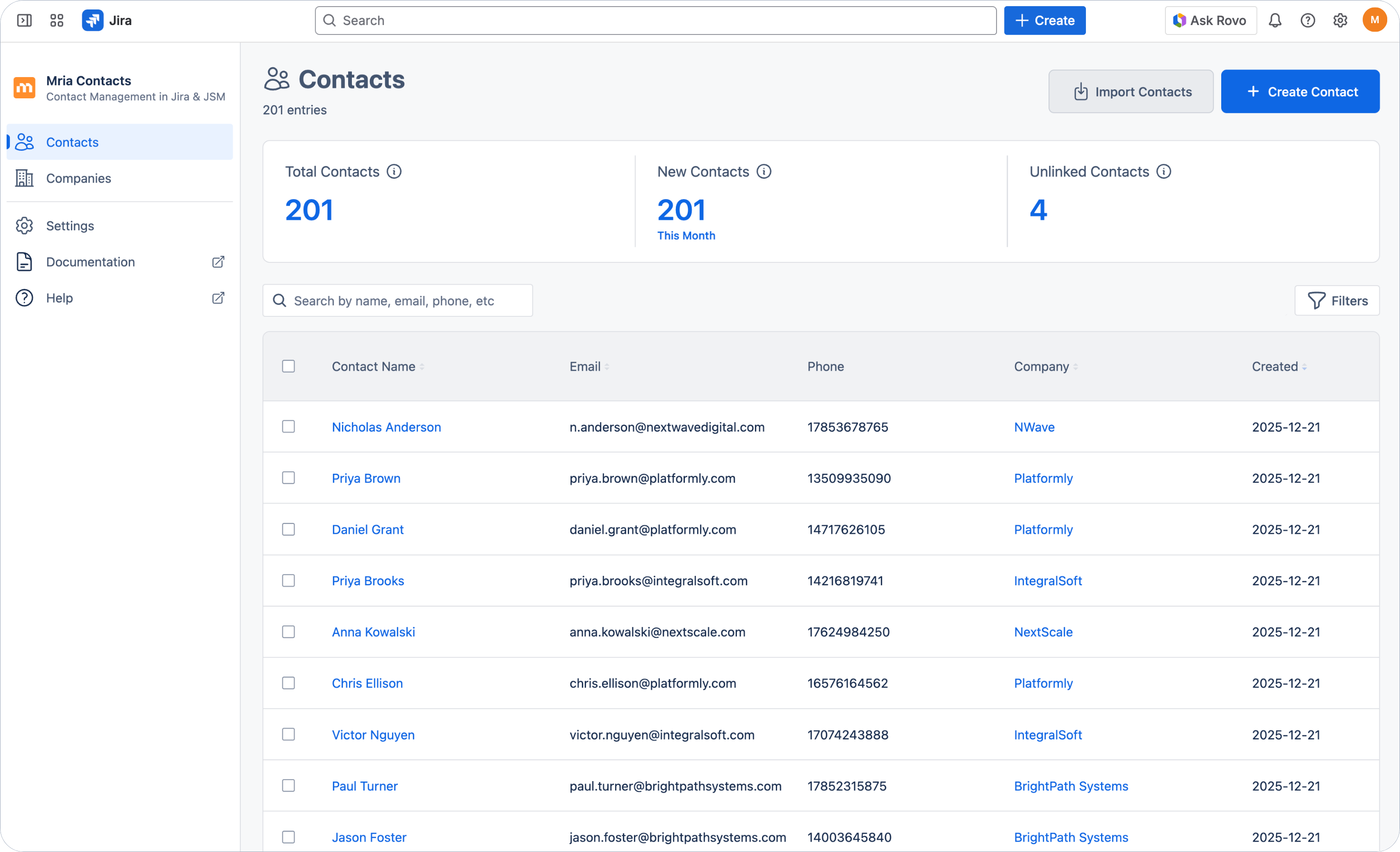 Add Mria Contacts to your Jira Cloud site directly from the Atlassian Marketplace—no external setup or integrations required.