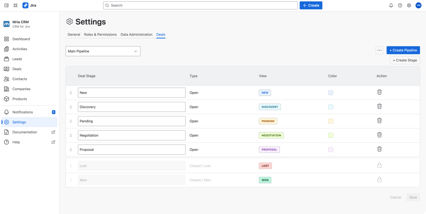 Pipeline configuration is available directly in Mria CRM → Settings → Deals.