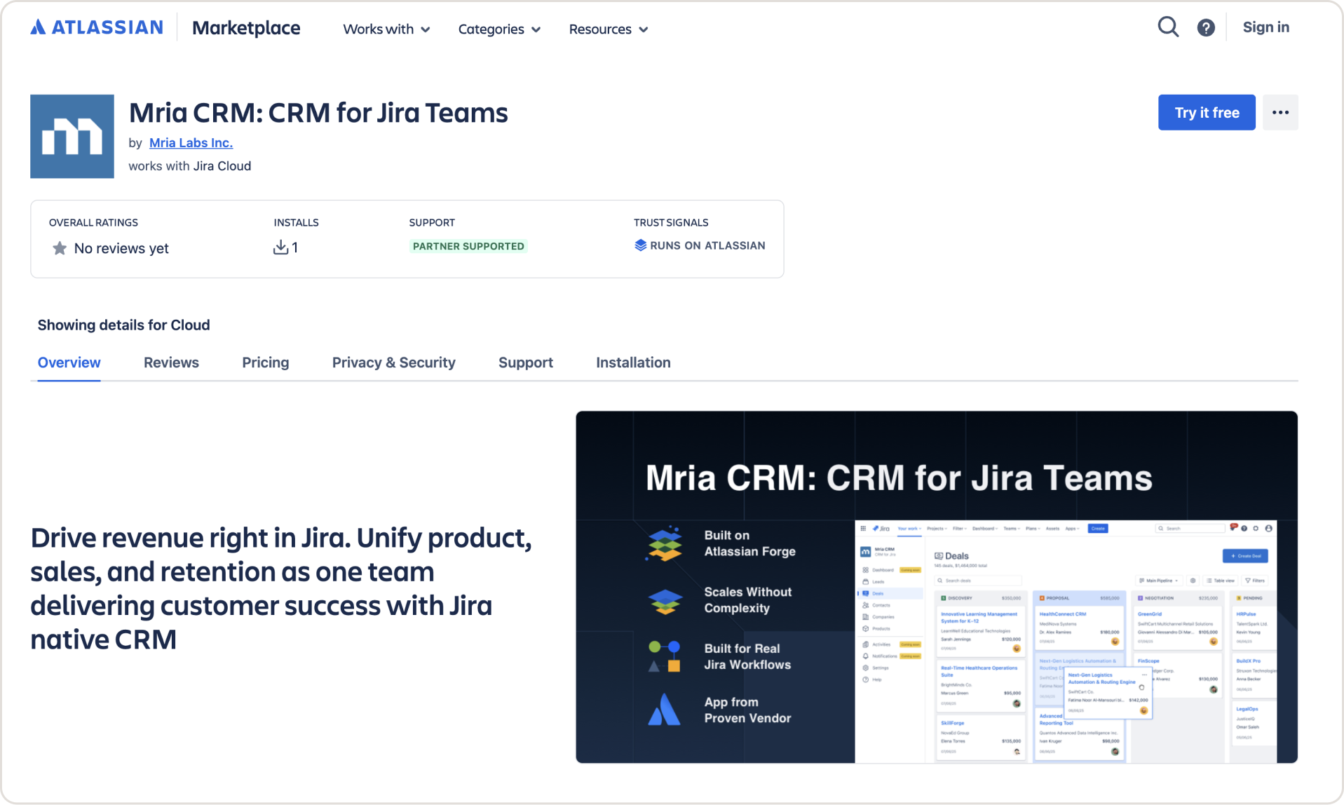 Add Mria CRM to your Jira Cloud workspace in just a few clicks.